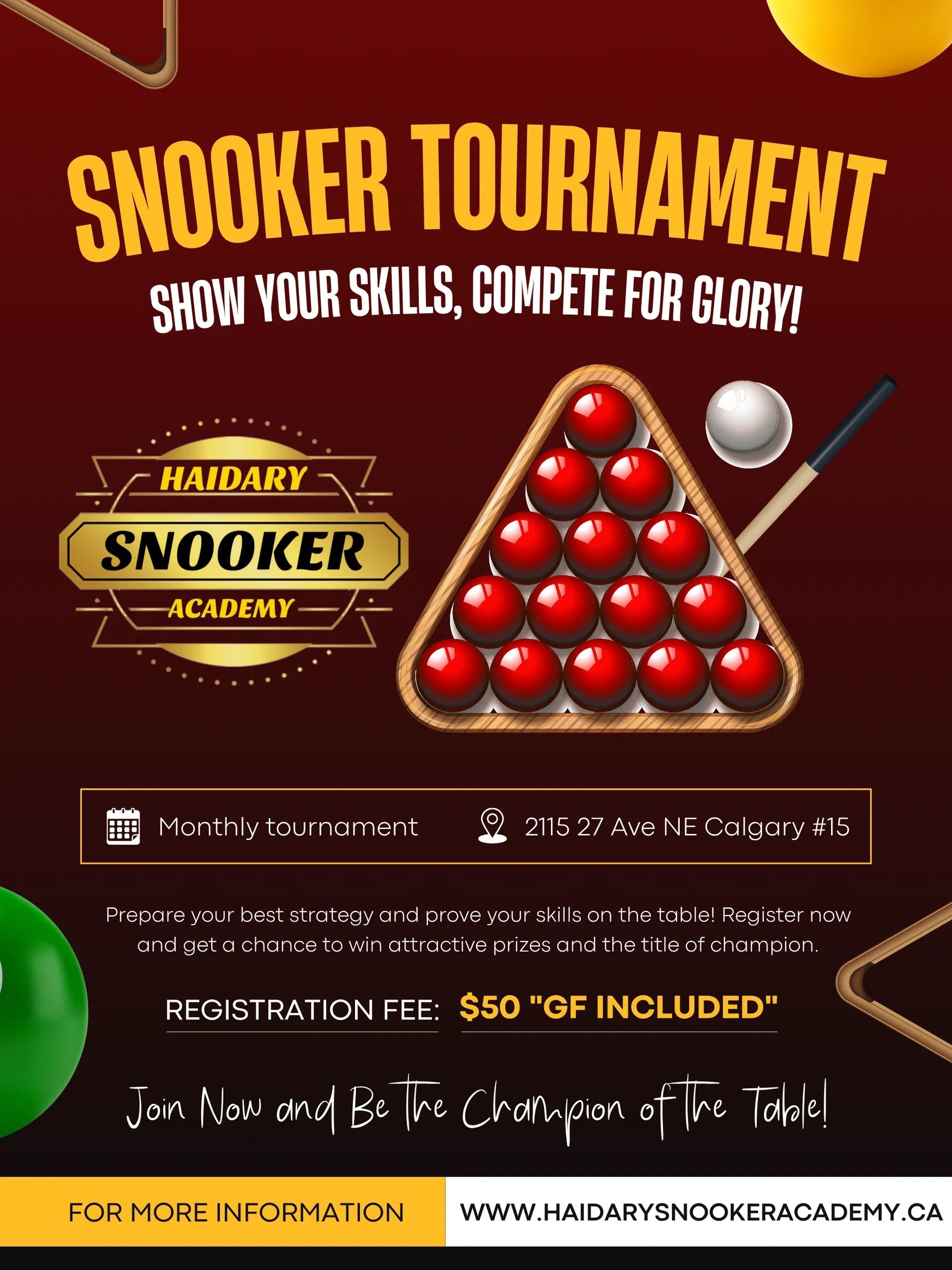 Founded in September 2024 and officially licensed in October, Haidary Snooker Academy was born from a passion to bring world-class snooker training and facilities to Calgary. As a family-owned business, we understand the importance of creating a welcoming space where players of all ages and abilities can grow, compete, and connect. Our recognition by the WPBSA and listing on Snooker Canada's directory reflects our commitment to excellence and our dedication to elevating the sport in Western Canada.